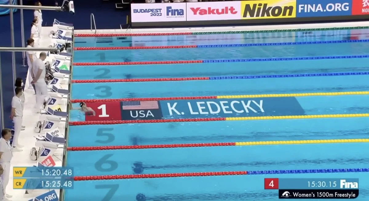 Katie Ledecky won the 1,500-meter swim so far in advance of her competitors that they were out of view. Incredible!